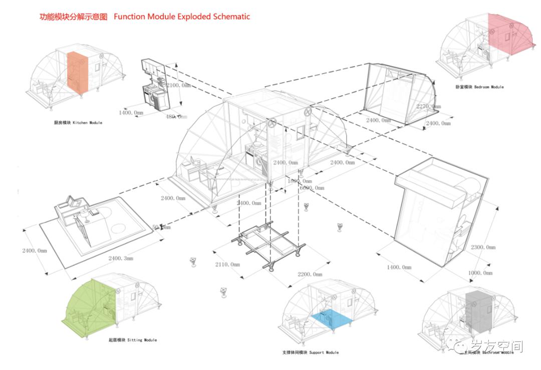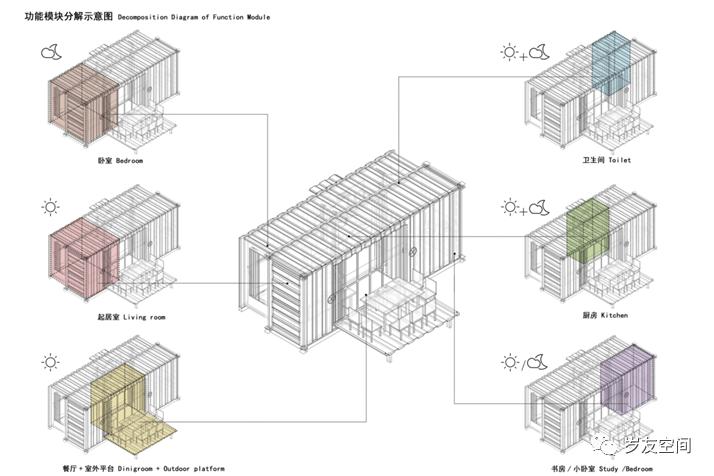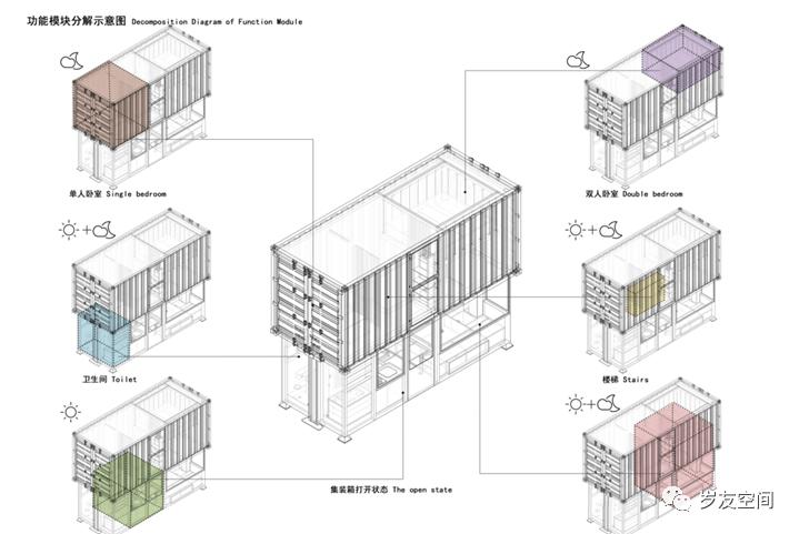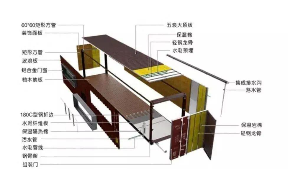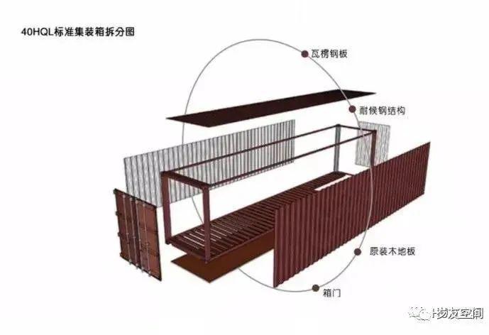 集裝箱在建筑上應用一般采用高箱、特種箱或定制箱體來做。集裝箱建筑體系拆分圖具體如下。