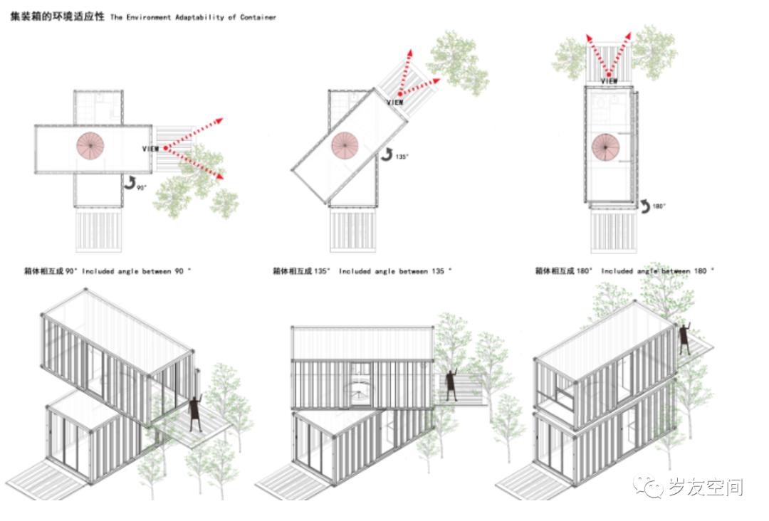 在集裝箱組合式創(chuàng)新方面,可以通過幾個集裝箱,以不同角度,高度來產生一些架空,陽臺,走廊等空間。平面的并聯(lián)、錯位、對角等營造空間。集裝箱常用的集中豎向空間關系,長短不一,可以產生一些露天陽臺;角度旋轉,可以產生一些不規(guī)則陽臺與避雨空間,錯位關系,可以創(chuàng)造不同方向的陽臺。平面拼接是能夠決定集裝箱建筑是否具有魅力的一大原因,空間好不好用,距離感把握的好不好都來源于此??紤]防盜等安全要素,也可以將集裝箱本身的長邊作為良好的屏障。卸下上層的結構構件,將下層構件轉換成可以轉動的,從而歇業(yè)時恢復集裝箱原樣,白天將其打開落地,露出室內場景,同時外部的集裝箱板還可以落地形成入口小廣場小空間,供人們在露天休息,喝茶都可以。